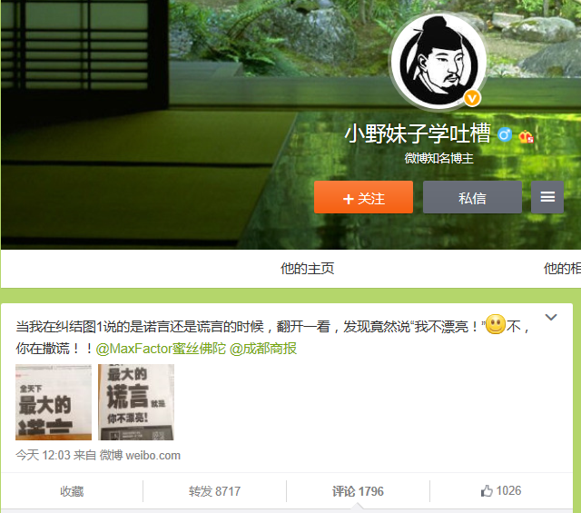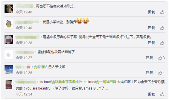 蜜絲佛陀這句話在愚人節(jié)直接擊中了無數(shù)女生的內(nèi)心。不少網(wǎng)友評價“看到這句我的心都要陶醉了”。網(wǎng)絡(luò)紅人小野妹子學(xué)吐槽更是開玩笑發(fā)微博說:找個會化妝的女朋友,愚人節(jié)每天都過。