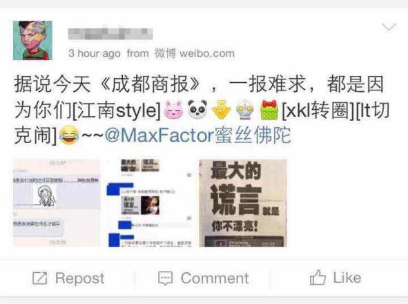 有網(wǎng)友看到《成都商報》的半版報紙后提出:這是“諾言”還是“謊言”?其實何需介意謊言、諾言的一線之差,打開全版后,蜜絲佛陀便會給你答案——全天下最大的謊言,就是“你不漂亮”!言下之意就是You are beautiful(你很漂亮)!
