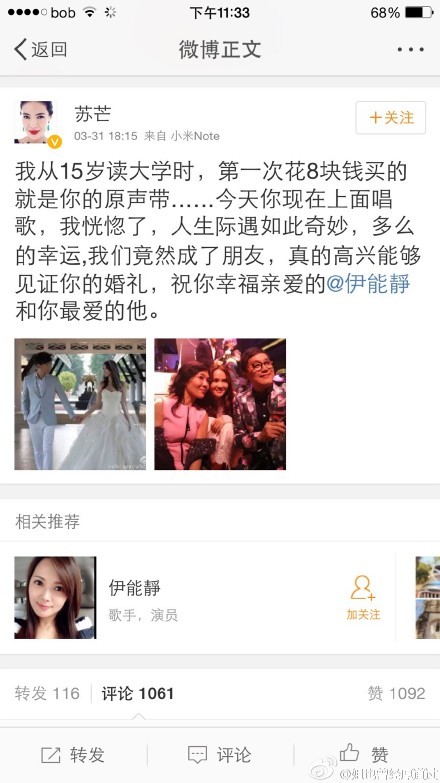 嬌羞似少女3月31日晚,時尚集團總裁、《時尚芭莎》總編輯、“芭莎明星慈善夜”創辦人蘇芒發微博稱:我從15歲讀大學時,第一次花8塊錢買的就是你的原聲帶。今天你現在上面唱歌,我恍惚了。人生機遇如此奇妙,那么幸運,我們竟然成了朋友。真的高興能夠見證你的婚禮,祝你幸福親愛的@伊能靜和你最愛的他。并附上婚禮現場照片,強調稱:純現場無p圖。事后被蘇芒本人秒刪,但是已經被細心的網友留存。