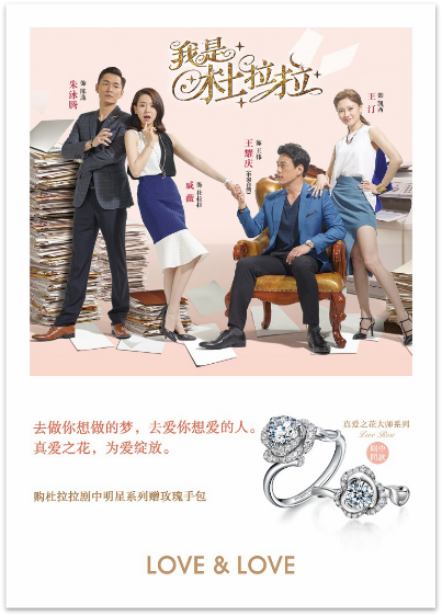 《我是杜拉拉》臨近劇終,陪伴杜拉拉由職場菜鳥到職場精英再經歷情場、家庭的考驗和重重困難,我們看到各個時期不同狀態杜拉拉,而戚薇本人在2014年與愛人李承鉉舉行了甜蜜婚禮,并于年初晉升為辣媽又多了幾分成熟女人味,和劇中杜拉拉一樣經歷了婚姻歷練的她想必對角色會有全新的理解和詮釋。在劇中無論是戚薇著一身男主為其準備的黑婚紗亮相婚禮,并獲得男主深情告白“因為你是特別的”,彼此深情交換LOVE&LOVE對戒還是大結局王偉手持LOVE&LOVE真愛之花鉆戒等候杜拉拉的場景,再次向杜拉拉求婚,都很好的印證了戚薇當下的狀態,戲里戲外滿滿都是愛與被愛,真愛之花綻放炫麗。