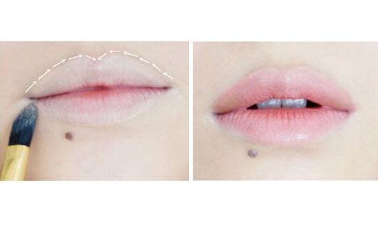 14.先用遮瑕膏遮掉唇周,虛化唇線,尤其是下唇需要多遮住一些。按照小骨唇形涂抹春噶,上唇略翹,下唇相對來說薄一點,唇珠邊緣和下唇邊緣輕掃些修容粉突出唇形。