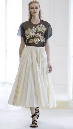 迪奧套裝(Bar Suit)作為迪奧品牌的精髓,成為本季的設(shè)計(jì)主線(xiàn)而不斷被強(qiáng)調(diào)。如今,設(shè)計(jì)靈感在原有的基礎(chǔ)上不斷突破,迪奧套裝的標(biāo)志廓形:沙漏型的外套和超大裙擺,再次被運(yùn)用到本季設(shè)計(jì)中,而強(qiáng)烈對(duì)比的黑白兩色也成為本季的色彩基調(diào)。