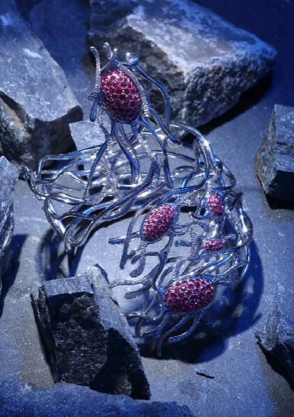 海百合系列:創(chuàng)意靈感源于神奇的海洋生物海百合,這種美麗的史前生物腕足細長并隨著海底波浪擺動。在結(jié)構(gòu)上,設計師更看重“上天造物”的神奇,根據(jù)海百合腕節(jié)眾多、可任意卷曲、附著性強的特點,設計出貼合佩戴者手臂脖頸的曲線,可拆分的單元結(jié)構(gòu)層層打造多重組合之美。