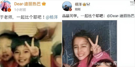 迪麗熱巴曾經在新劇《你是我的榮耀》營業期間,于社交平臺發了一張演員楊洋的童年照,配文到:于老師,一起比個耶吧。不久后,楊洋回應著在社交平臺上發了一張迪麗熱巴的童年照,也進行相同格式的配文:晶晶同學,一起比個耶吧。這次互動讓很多網友都覺得這二人cp感也太足了,就像是劇中情節走到了現實中。