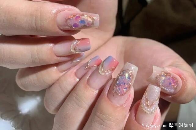 這一款看起來非常高貴,底色是透明的,然后用銀粉漸變的鋪滿,指甲頂端最多,鑲上幾個大小不一的鉆石,這一下簡直就是畫龍點睛,這一款美甲適合御姐風的姐妹們,非常亮眼。