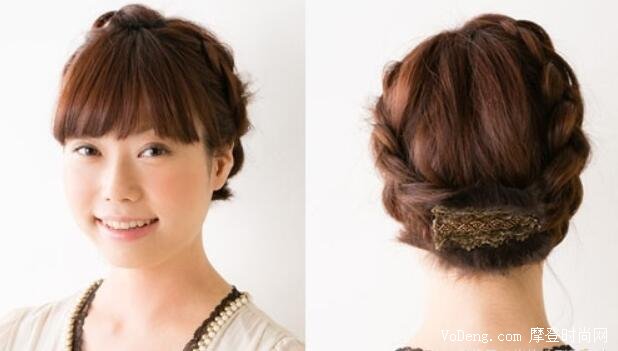 這一款發型簡直就是迪士尼在逃公主啊,非常適合長頭發空氣劉海或者齊劉海的姐妹,先將頭發的上半部分扎起來固定在腦后,然后將兩邊低下的頭發分成兩個麻花,將兩邊的麻花纏上來,最后再拿發夾固定好兩邊的麻花。