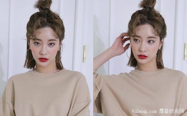 如果是燙了羊毛卷的姐妹,可以嘗試半丸子頭,前面留一點劉海,后面的丸子可以抽出來幾撮頭發,這個丸子頭的精髓就在于那一點凌亂感,而且肩膀以上的短發女孩扎這款發型非常加分。
