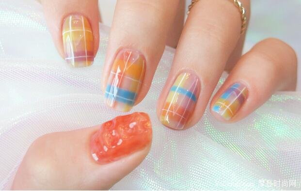 橙色、藍色、紫色融合在一起,看起來充滿了夏日風,大拇指使用透色多次疊涂,這款美甲非常清透,已經讓我感受到了在夏威夷海灘度假,滴!你的夏季限定美甲已到。