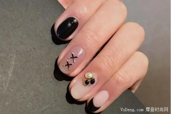 這款美甲采用暗黑系風格,純黑色和乳白色作為底色,沒有那么多花里胡哨的元素,只點綴幾個金屬,朋克風拉滿,很多穿搭比較中性或者暗黑風的姐妹一定不要錯過這款美甲。