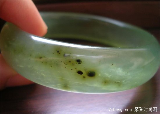 黑點屬于玉忠常見的一種雜質,我們都知道要選黑點較少的,而這個時候,我們就可以戴上手,然后轉著圈來觀察玉手鐲的佩戴效果,選擇那個看起來顏色跳躍小的就行。