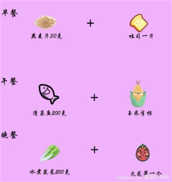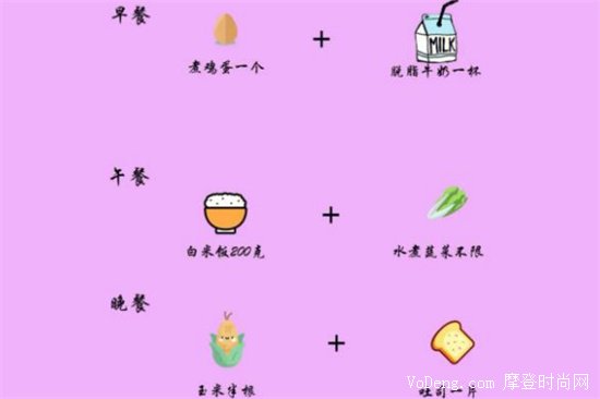 周一早上吃一個煮雞蛋,外加脫脂牛奶,如果你乳糖不耐受,可以換成燕麥奶;中午吃一拳頭大小的米飯足矣,外加不限量的水煮菜,例如生菜等;晚上可以吃像玉米一類的粗糧以及一片吐司,如果你覺得只吃吐司沒有胃口,可以在上面涂抹一點無糖無脂的果醬。