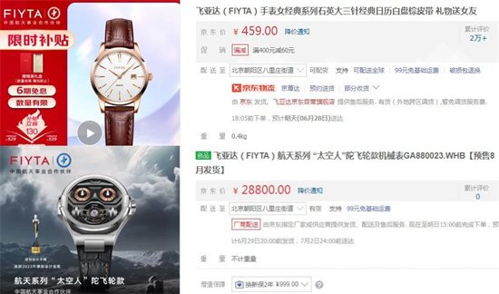 飛亞達表價格還算親民的,性價比很高,在售的最低價產品是,經典系列石英大三針經典日歷白盤棕皮帶,售價459元;而最高售價的航天系列 “太空人”陀飛輪款機械表GA880023,售價28800元。