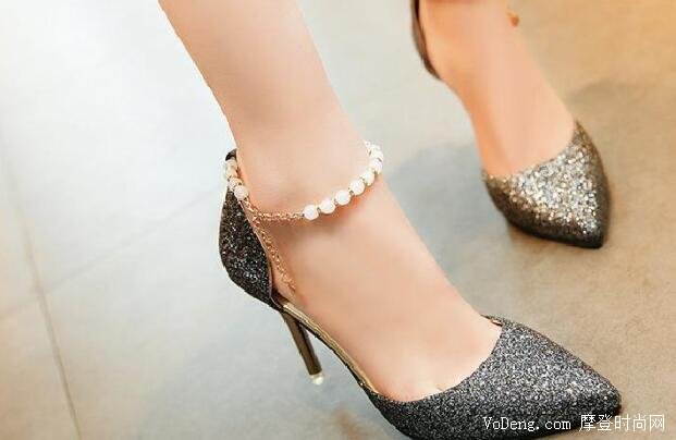 3、接下來這款鞋子就更好看了,鞋面通身都是采用的黑色磨砂質地,表層涂抹了一層又一層的的銀色細閃粉,而且這款鞋子的環扣設計真的很好看,是用了玉珠子穿在一起的,看起來更像一個腳環,鞋子的里面底部是金黃色的,這款鞋子穿上絕對足夠吸人眼睛。