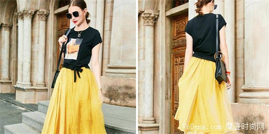 經典的黑色是一種與什么顏色搭配都不會出錯的顏色,與黃色搭配起來更是如此!黃色的艷麗明亮,剛好就中和了黑色的嚴肅沉悶感。而且黑色的明度又將黃色的明度壓下去了一點,二者的搭配就變得非常協調。黃色也可以作為畫龍點睛的飾品出現在一身黑之中,時尚感十足。
