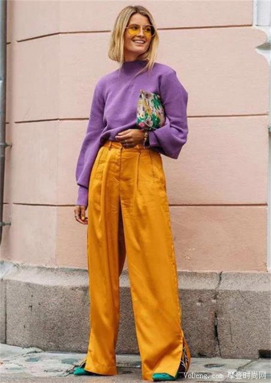 香芋紫這種顏色非常減齡,很有俏皮感。而它與黃色、特別是土黃色,撞色的設計搭配起來,就能夠將你的慵懶感發揮極致,而且還能顯得你非常年輕時尚!