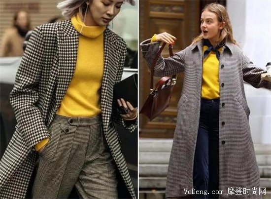 我們在穿著灰色千鳥格的大衣或者是西裝的時候,如果你覺得你的整套搭配太過于沉悶,那么你就可以選擇一件黃色的衣物作為內搭,跳脫感一下子就出來了,非常顯氣質!