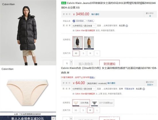 ck家最貴的就是中長(zhǎng)款鴨絨絎縫羽絨服ZW02246了,一件要價(jià)3490元;而它家的女士滿印棉質(zhì)性感透氣比基尼內(nèi)褲QD3785,一件64元。
