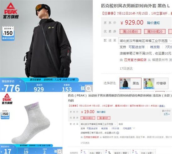 它家的匹克梭織風衣男新款時尚外套是最貴的產品,要價929元;而運動襪子男女通用新款百搭時尚舒適經典款休閑襪,只要19元一雙。