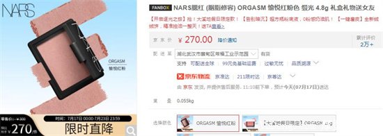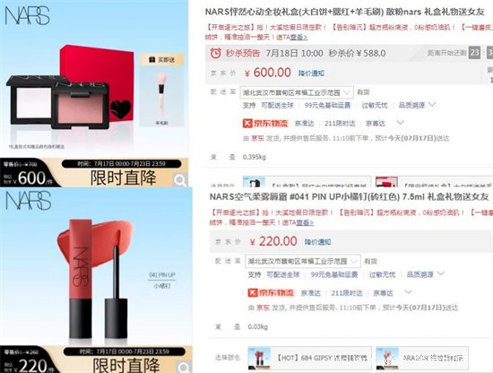 在它家在售的產品中,NARS怦然心動全妝禮盒是它家最貴的產品,一組下來要600元;NARS空氣柔霧唇霜,只要220元就能到手。