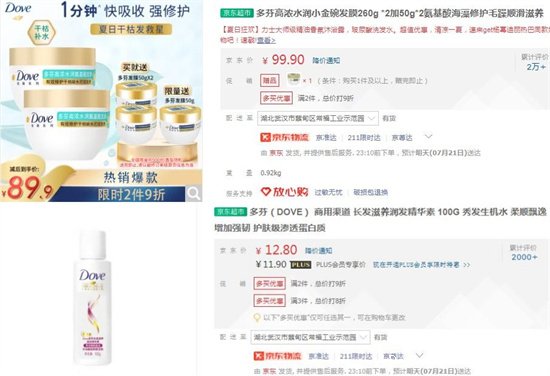 多芬家實在是物美價廉!價格最高的多芬高濃水潤小金碗發膜兩罐,還外加一對贈品,也不超過百元,才99元;而最便宜的長發滋養潤發精華素,才12.8元。同等用料的洗發水可能都要上百元了,多芬卻一直將定價調整到百元以內,實在是性價比超高!