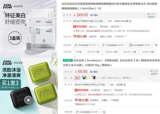 它家最貴的是美白淡斑緊致兩部曲,三盒面膜169元,性價比超高;而最便宜的是朵拉朵尚手工皂小綠皂110g,只要59.9元。