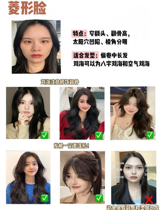 菱形臉的姐妹們的額頭通常很窄,但是顴骨非常突出,太陽穴是凹進去的,棱角分明。建議你去剪八字劉海這種可以弱化顴骨存在感的發(fā)型,也要注意自己的頭發(fā)的蓬松度。