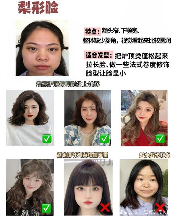 梨形臉就是正三角臉型,通常額頭較窄但是下頜非常寬。這種臉型就不要嘗試齊劉海了,可以選擇一些稍卷的齊肩短發(fā),這樣就能讓你存在感極強的下頜修飾掉了。