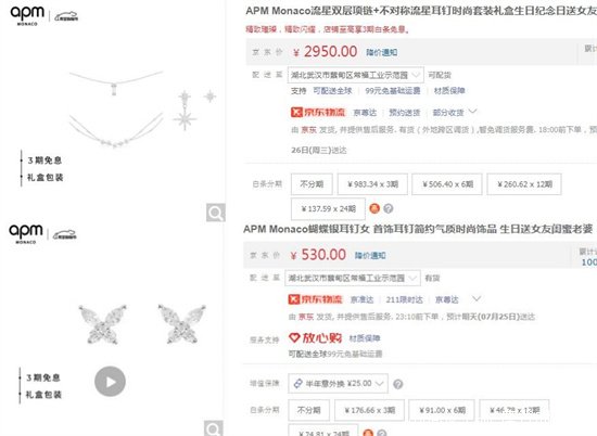 它家最貴的產品是,流星雙層項鏈和不對稱流星耳釘時尚套裝,一套是2950元;而它家價格最低的是蝴蝶銀耳釘女,一件530元。