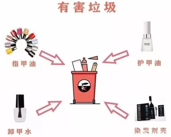 有一些化妝品一旦過期了,就會產生一些對人體有很大危害的物質。例如染發劑、指甲油、護甲油、染發焗油等,里面通常會有很多的化學成分。而且這類產品的揮發性比較強,如果你隨便亂扔,會給自然環境以及接觸的人群造成危害,屬于是有害垃圾。