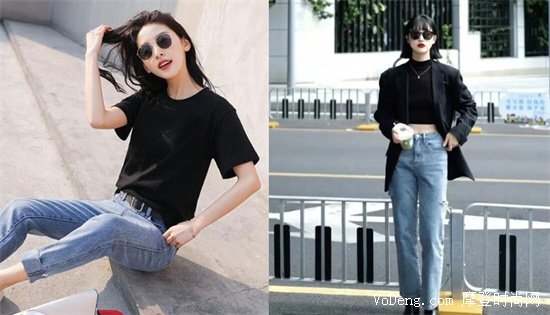 黑色的上衣與牛仔褲的藍色搭配起來,是非常適合夏天的。藍色給嚴肅的黑色,帶來了意思青春的朝氣,二者的搭配也是非常適合學生黨的。