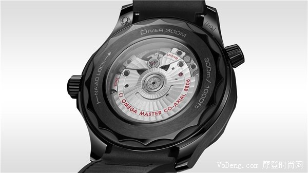 翻轉(zhuǎn)腕表,表背同樣選用黑色陶瓷材質(zhì)打造,經(jīng)拋光和拉絲工藝處理。采用背透設(shè)計,透過波紋邊緣設(shè)計的藍寶石玻璃表背,歐米茄8806至臻天文臺機芯的運轉(zhuǎn)美態(tài)清晰可見。這枚機芯配備55小時的動力儲存,足以滿足日常所需。